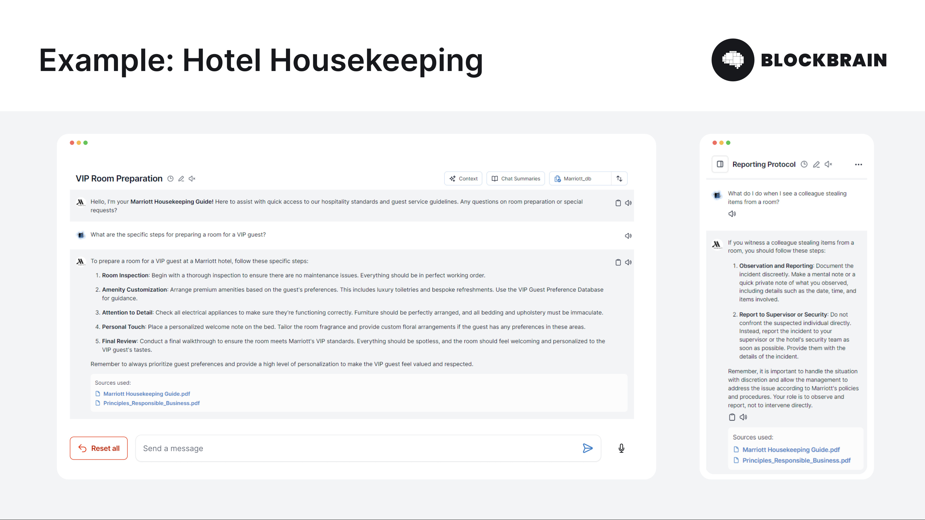 | Hotel-Housekeeping-Bot       | Reinigungsprotokolle, Mitarbeiterpläne, Schulungsdokumente                       | Schulung und Koordination von Hauskeeping-Aufgaben                      |