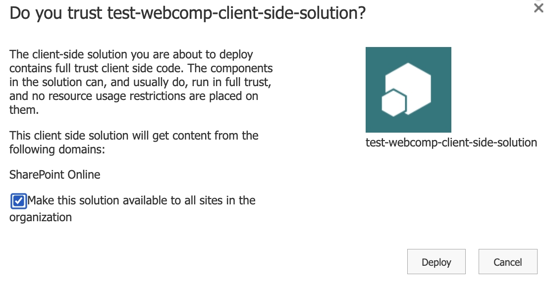 .sppkg-Datei in den App-Katalog hochgeladen haben.Aktivieren Sie Diese Lösung für alle Standorte verfügbar machen, wenn Sie möchten, dass es in Websitesammlungen erscheint.