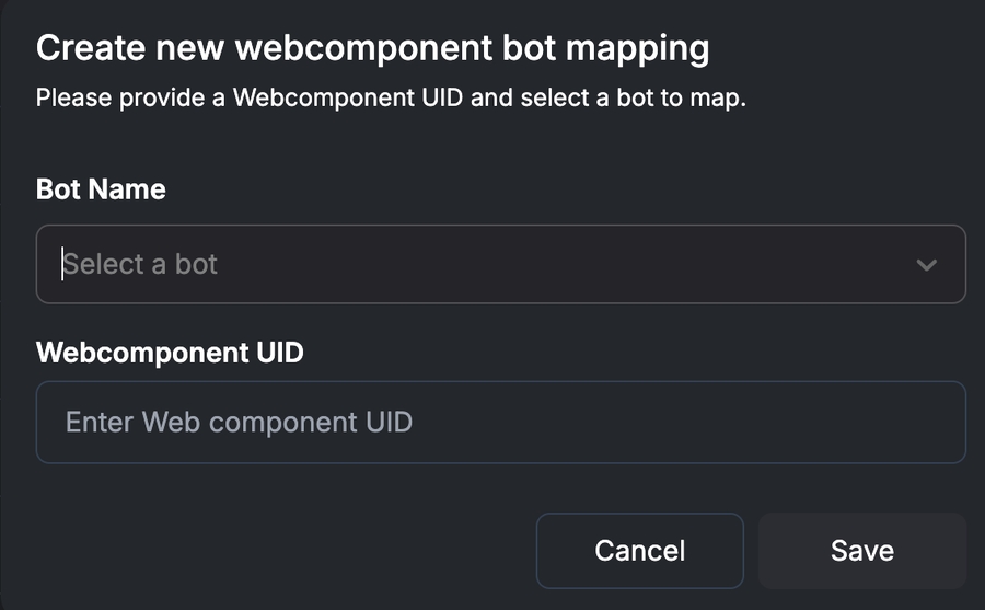 Im Modal "Neue WebComponent-Bot-Zuordnung erstellen" erscheint: