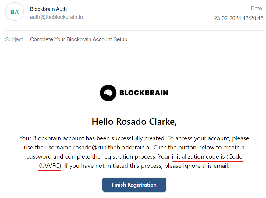 Es sollte sichergestellt werden, dass die E-Mail von <auth@theblockbrain.io> stammt, um deren Echtheit zu gewährleisten.