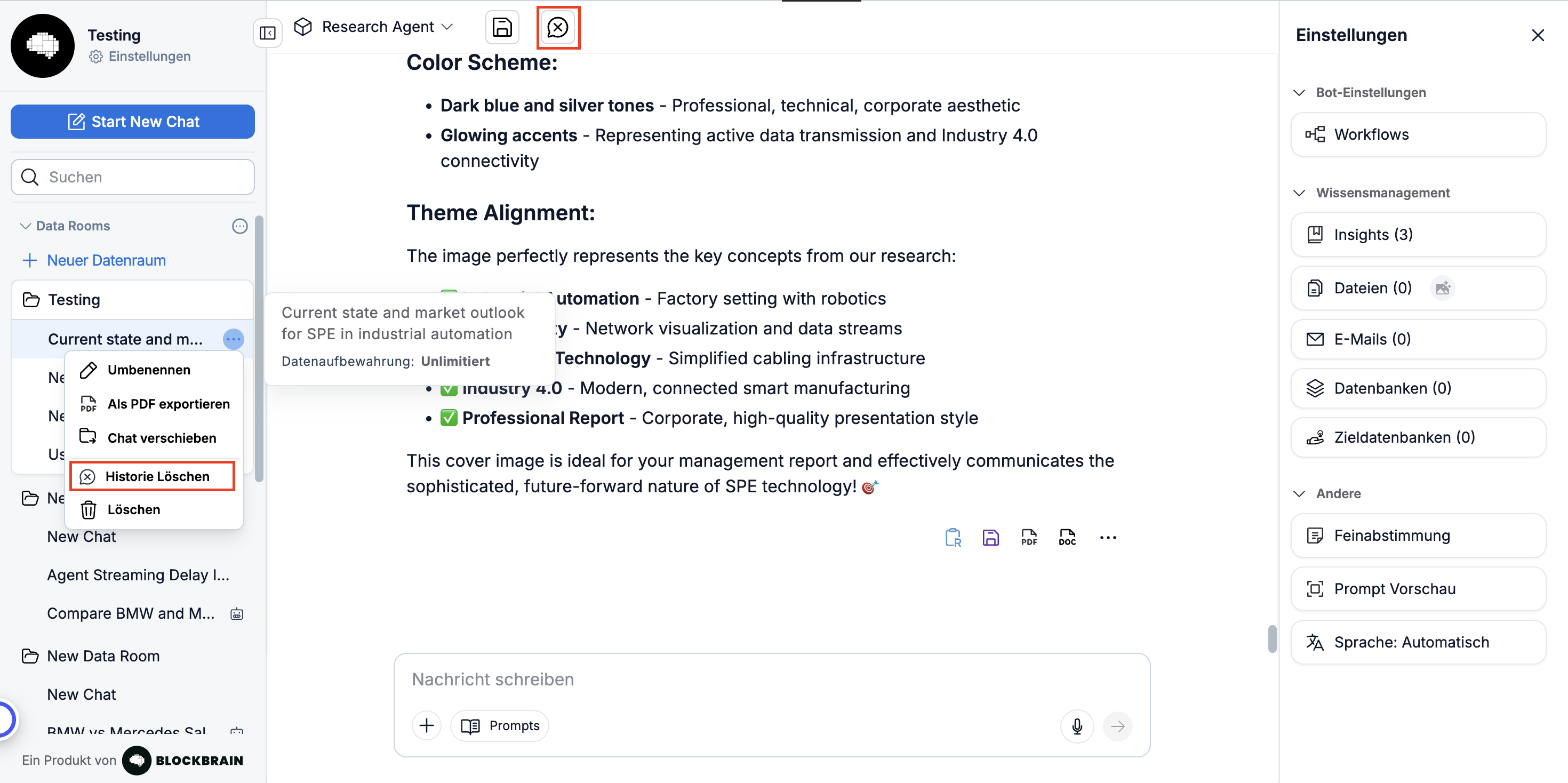 4. [Schaltfläche „Agentenverlauf löschen" & aktualisiertes Symbol](https://docs.de.theblockbrain.ai/neues/funktionen-and-updates#id-4.-schaltflache-agentenverlauf-loschen-and-aktualisiertes-symbol) – Eine neue Schaltfläche „Agentenverlauf löschen" ist jetzt direkt in der Nachrichten-Symbolleiste verfügbar, ergänzt durch ein überarbeitetes Symbol für eine klarere visuelle Darstellung der Zurücksetzungsaktion.